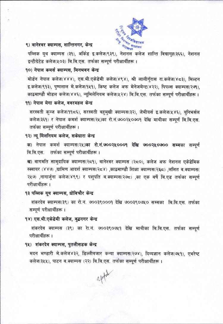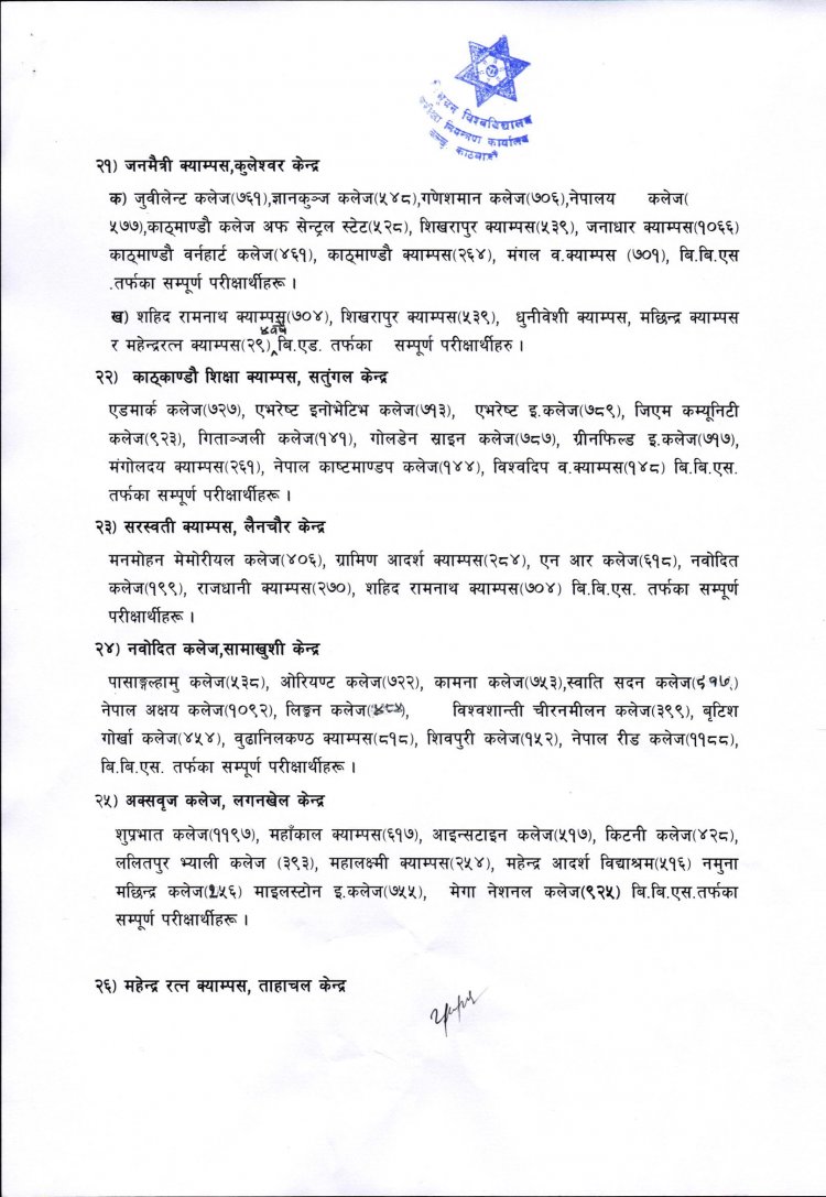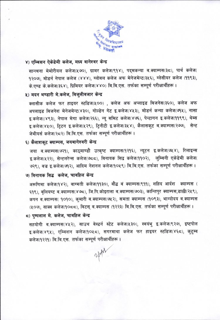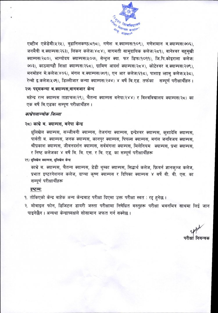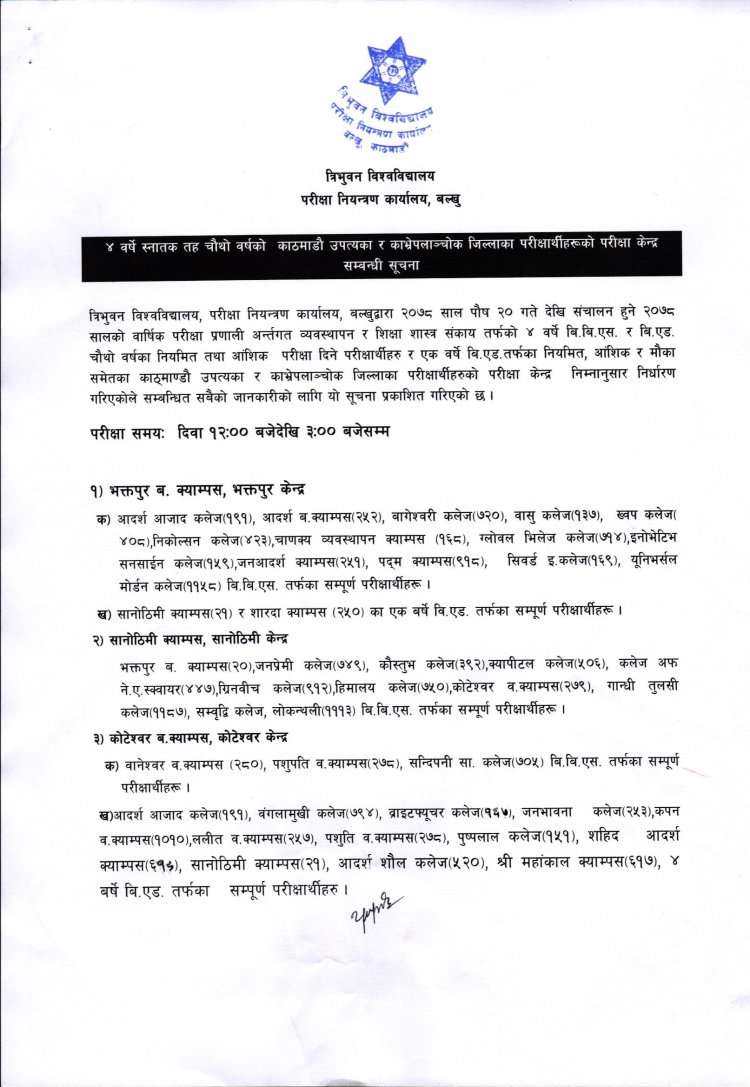 ४ वर्षे स्नातक तह चौथो वर्षको काठमाडौं उपत्यका र काभ्रेप्लान्चोक जिल्लाका परीक्षार्थीहरुको परीक्षा केन्द्र सम्वन्धि सूचना